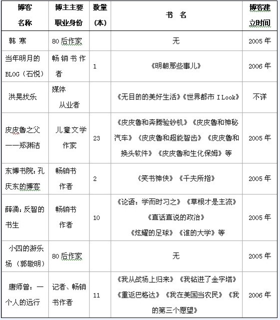 表一 2008年10月6日新浪畅销书作者博客的图书广告内容收集