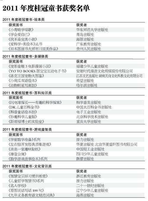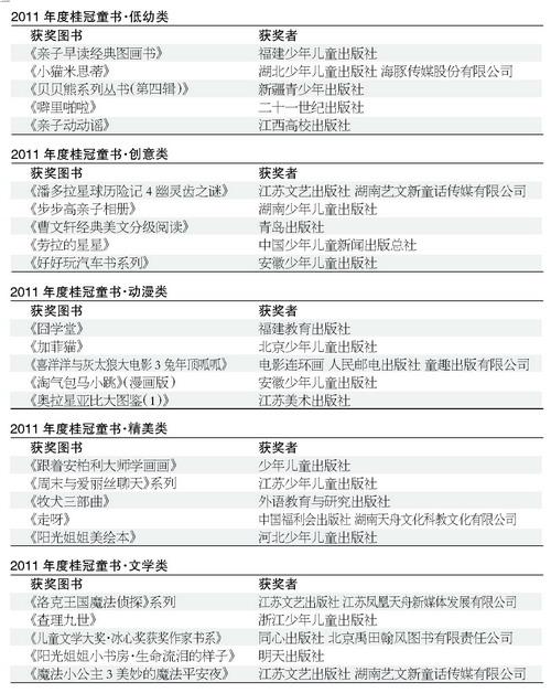 1月6日,由中国出版工作者协会少儿读物工作委员会和出版商务周报社主办的“2011年度桂冠童书”颁奖盛典在国家图书馆文会堂举行,此次盛典以“书香童年,快乐阅读”为主题。“年度桂冠童书”评选不仅是上下游的交流平台,更是面向读者的一次阅读推广。