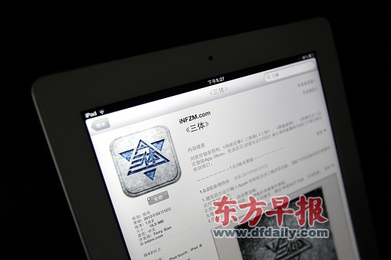 就算是《三体》的作者刘慈欣对这个应用也不乐观,他想到的是盗版和纸质书发行在先。目前可能困扰《三体》APP版的是,在苹果应用商店里输入“三体”两个字,除了正版的APP还会出现一批未经授权的《三体》APP,后者免费或者价格更低。其实这也是苹果不鼓励图书做单行本APP的原因之一,因为目前的苹果审核并不能完全杜绝盗版,在收费的正版和免费的盗版间做选择,也有人会选择后者。所以刘慈欣对早报记者说:“对于前景,我不认为销量会特别大,因为盗版的存在,也因为很多人都看过纸质书了。而且,这本书APP的价格要30元,没有太大的价格优势,在电子书里算是比较贵的。”