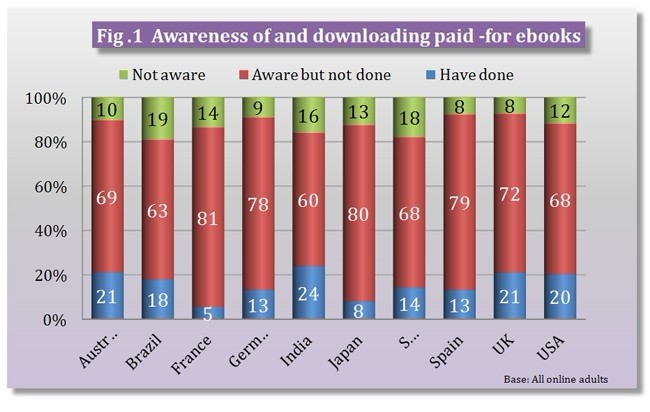鲍克是在2012年年初,针对10个国家的网络用户开展研究的,分别是澳大利亚、巴西、法国、德国、印度、日本、韩国、西班牙、英国和美国。其中印度、澳大利亚、英国和美国在用户电子书接受程度上引领全球,总共有超过20%受访者表示他们在6个月前购买过电子书。其中法国与日本用户购买电子书的比例最低,分别是5%和8%。虽然在购买行为上不同国家千差万别,但是在电子书的认识上比较一致:超过80%的受访者知道如何下载电子书(图1)。