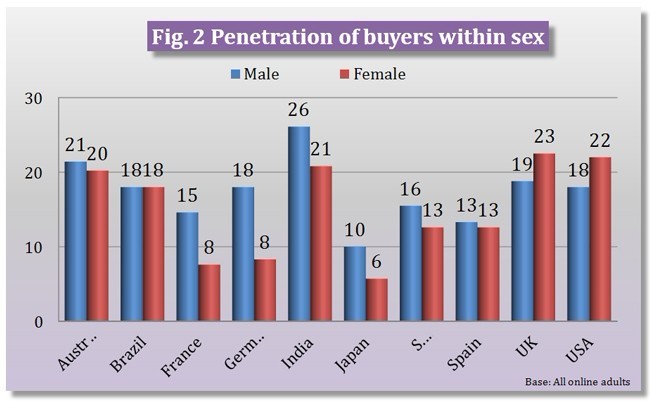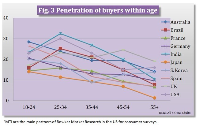 年龄和性别是与购买行为密切相关的指标。举例来说,在大部分国家,男性比女性更愿意购买电子书(图2),德国表现出最大的差异,有18%的男性表示他们在最近6个月里购买过电子书,与之相比,只有8%的女性表示有同样购买行为。在几乎所有市场中,受访者年龄越大,最近购买电子书的可能性越小(图3)。在印度、巴西、英国、美国和法国,电子书购买率最高的年龄阶段是25-34岁,澳大利亚、西班牙、德国、韩国和日本则为18-24岁。