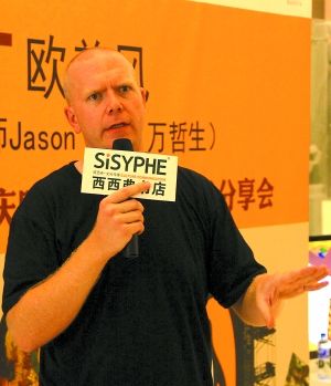 万哲生,这是英国人Jason Pym结婚,随妻子万可的姓而取的中文名字。因旅行爱上中国,在英国学了中文,后又来华做过平面设计、当过娱记、图书封面设计师。昨天,这位中国的洋女婿受邀来到重庆,在重庆西西弗书店和读者们分享了图书封面设计的心得。