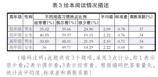 从表3可以看出,低年级女生和高年级女生绘本阅读时间的平均值相等,都为 2.22,而且均高于低年级男生和高年级男生,但是,高年级女生绘本阅读时间平均值的离散系数低于低年级女生,所以,高年级女生绘本阅读时间的平均值更具代表性。