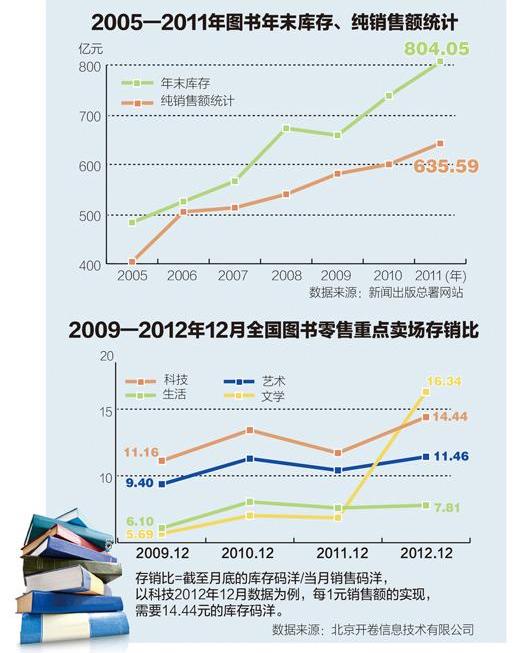 繁荣的景象之下,却是日渐沉重的库存负荷。全国新华书店系统、出版社自办发行单位纯销售额从2005年的403.95亿元增长到了2011年的653.59亿元,而年末库存则从482.92亿元飞涨到804.05亿元。6年时间,两者的剪刀差从近79亿元增长至150亿元——库存跑赢了销售,更多图书只能在仓库中蒙尘。
