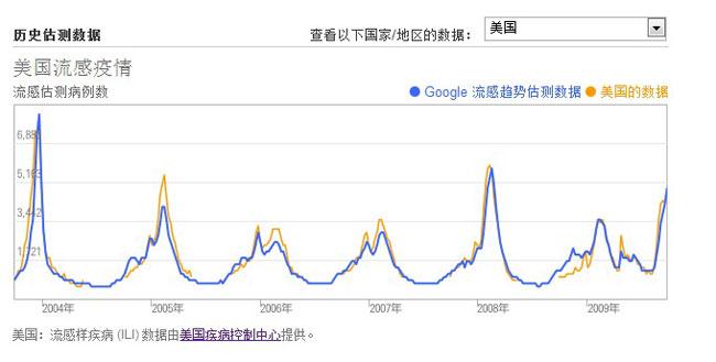 谈趋势谈大数据,怎么能不提谷歌的流感趋势呢?谷歌分析自己上亿次的搜索查询,近乎实时的提供全球许多国家和地区的流感疫情评估,从截图可以看出,谷歌的趋势曲线跟美国官方公布的数据重合度非常高,但是后者在时间和效率上完全无法比拟谷歌趋势。