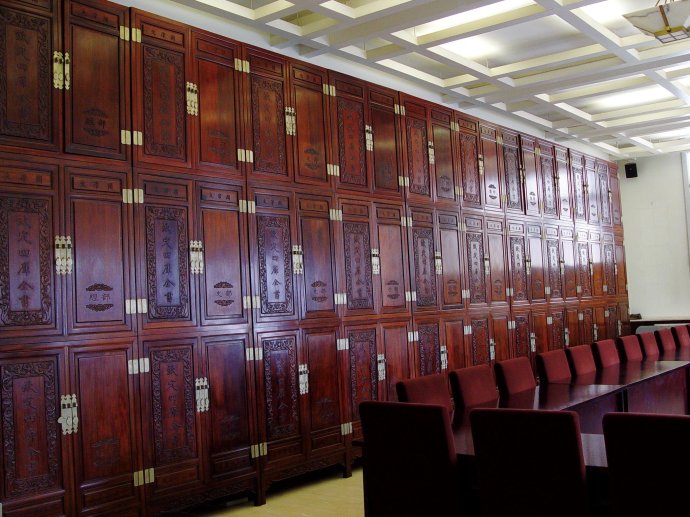 在杨德炎先生的追悼会上,他的遗像后的背景就是《四库全书》成书后的书柜图,他几次和我及有关朋友一起在文津厅书柜陈列前留影,设立“文津厅”也是杨德炎先生的创意。商务印书馆会议室以特殊意义命名的还“新华厅”、“菊生斋”,而以文津厅最为典雅大气,每当有重要活动及参观、接见,杨德炎先生都是以文津阁《四库全书》出版来展示百年商务印书馆的不懈追求。