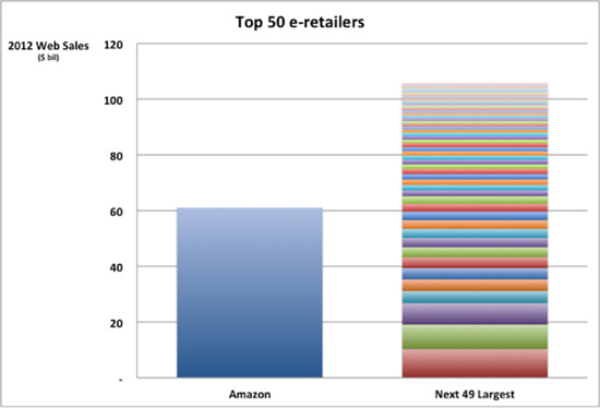 我之前曾在一篇博文中谈到过,亚马逊是怎样通过越来越大的成本优势以及疯狂追逐最低价格(至少大部分时间是这样),从而对实体商家形成重大威胁的。同理,亚马逊对于其它电子商务公司来说也是一个重大的竞争对手。