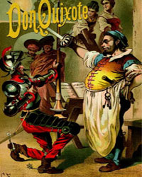 米格尔·塞万提斯的小说讲述了一名男子痴心于骑士的传说,他决定做一名骑士的故事是有史以来的第一本小说,最早出版于1612年。堂吉诃德的灾难在于他游历了整个西班牙的乡村为了找到证明错误是正确的证据和为受压迫的人们提供乐子迷住了一代又一代的读者。并且给我们了一句谚语“攻击假想敌”以表明出身高贵但却在做徒劳的努力。