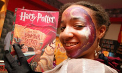 一位年轻的粉丝挥舞着他手中的《哈利波特与密室》,纽约时代华纳中心的书架边。图片来自Astrid Stawiarz