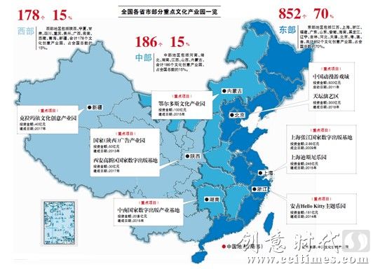中国文化创意产业网4月21日统计显示,目前已建文化创意产业园区共计1216个,园区分布于东、中、西部地区。