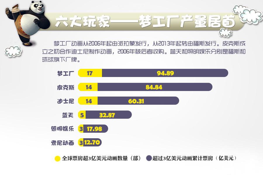 动画是一个烧钱的片型,少则投资几千万美元,多则上亿。而如今,好莱坞动画主要依靠海外市场,对营销和发行的要求非常高。因此,能在市场上立足并成功的大动画制作公司并不多,且多数都在大制片旗下。比如曾经的皮克斯,因为资金不足,一直跟迪士尼合作拍片,然后被后者收购。而梦工厂动画没有自己的强大发行部门,要依靠派拉蒙、福斯等大制片厂发行,付出的代价是约占票房15%的发行费用。目前产量最高的梦工厂由曾经的迪士尼动画一把手,后出走的卡曾伯格创建,2012年在中国上海设有分公司——东方梦工厂。