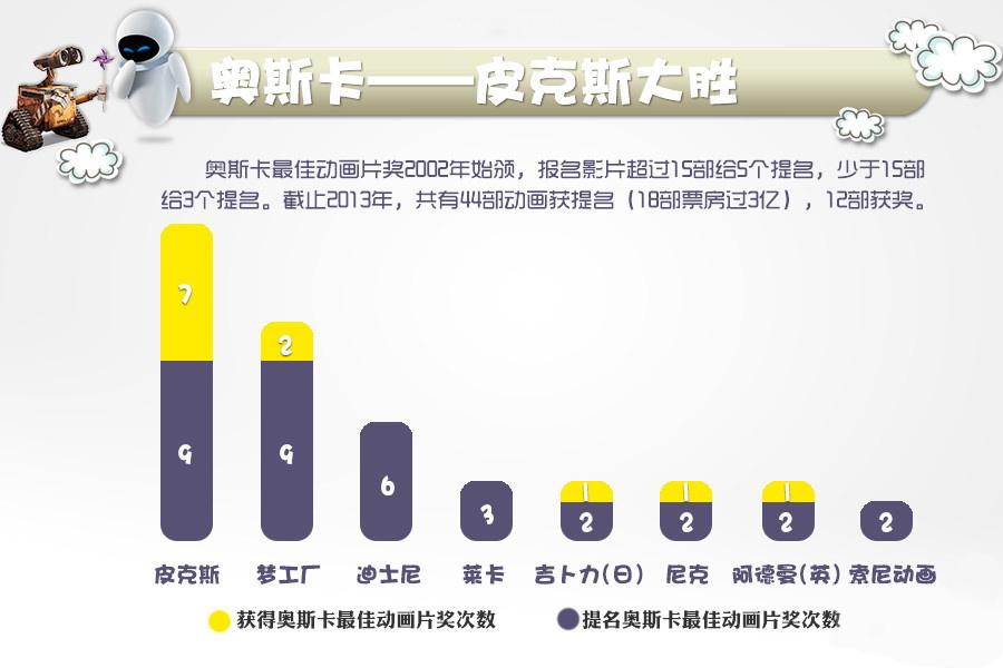 奥斯卡评委之所以爱皮克斯,是因为其团队讲故事的能力,以及锐意创新的精神。迪士尼、梦工厂、索尼动画多年提名一无所获或很少获奖,是因为在其厂牌下出产的动画,更追求合家欢效果,较难给成人观众大惊喜和大感动(况且奥斯卡评委们都是上了年纪的电影从业者,要求更高)。吉普力动画工作室获奖,几乎全是宫崎骏老先生的功劳。而阿德曼和莱卡是定格动画(包括粘土动画)的坚守者,它们出品的电影,虽然票房不能火爆,但品质大都上佳。比如《小鸡快跑》、《超级无敌掌门狗》(阿德曼)/《鬼妈妈》、《僵尸新娘》(莱卡)。