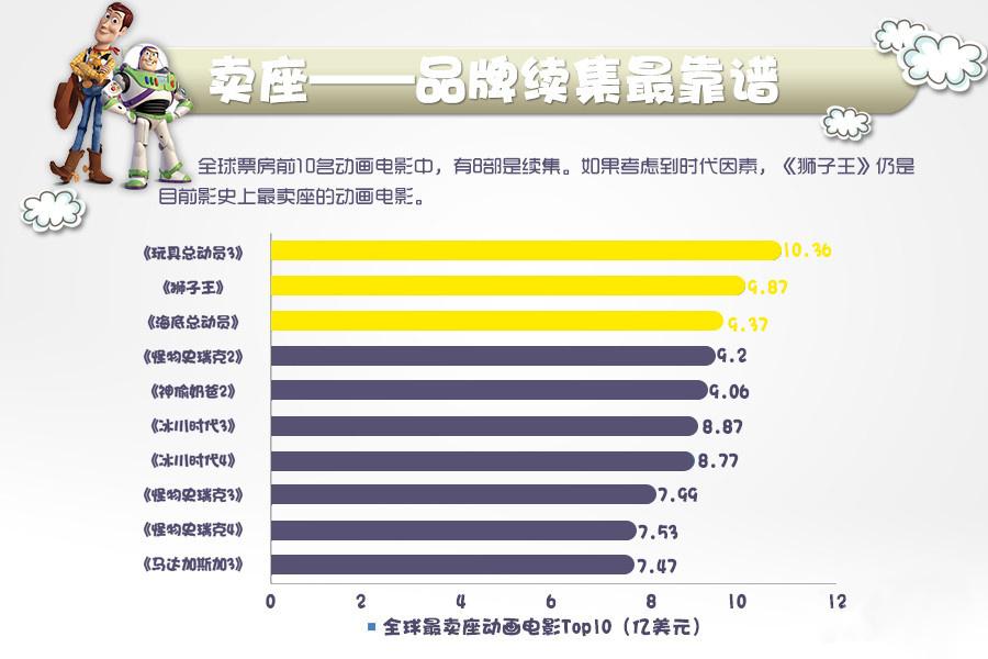 动画电影的最大特点在于,想象力可以天马行空,剧情可以朝很多方向发展。所以,它也是最容易制作续集的一种电影类型。而且,因为品牌效应,续集的受众会越来越多(前提是,影片品质得有保证,不能低于前作)。市场上卖座的包括《冰川时代》、《马达加斯加》、《怪物史瑞克》、《玩具总动员》、《功夫熊猫》等系列。