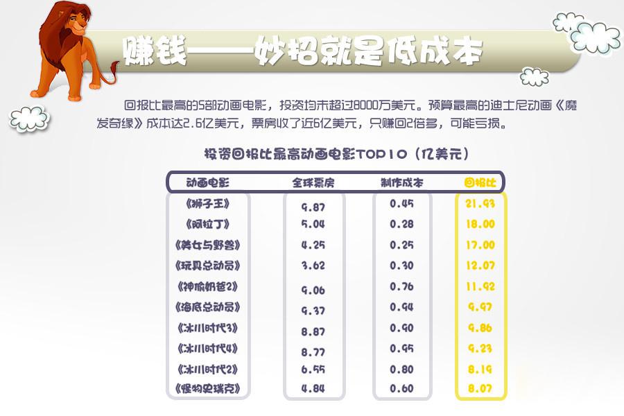 如今的好莱坞,制作成本超过一亿美元,就可称为大制作。在本文统计的60部票房过3亿美元动画电影中,有34部制作成本超过一亿美元。但是,投资高并不意味能赚钱;倒是投资相对较低,但品质过硬的作品,更容易有高回报。这一点,无论是动画电影,还是真人电影都是一样。目前被认为投资回报比最高的动画电影是《狮子王》,回报比21.93。而真人电影被认为是《灵动:鬼影实录》,该片制作成本15000美元,全球票房1.93亿美元,回报比超过12890。
