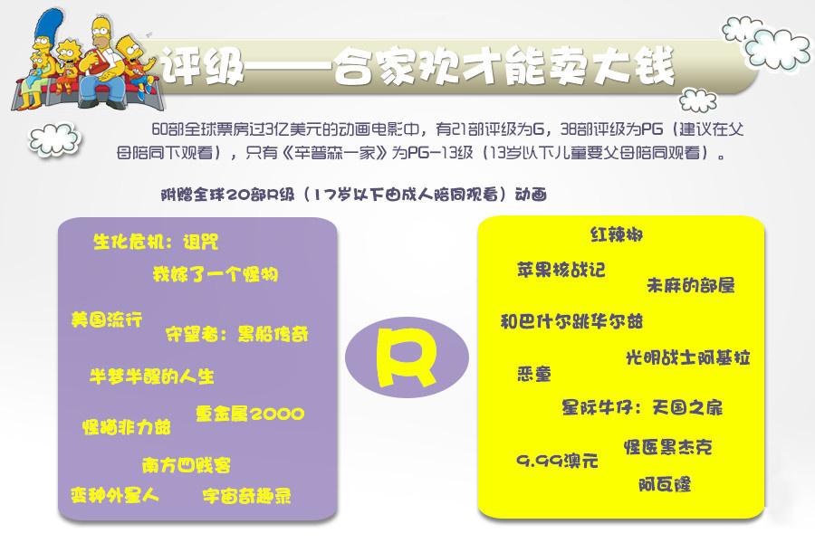 虽然主流市场上,动画片都是合家欢电影。但也有一些制作团队,对动画的理解不限于“小孩子看的东西”。因此我们也能看到,不少欧美、日本、法国等地的动画,题材各异,还关注到了人类生存过程中的种种命题。由于这些动画中的血腥、暴力、情色等元素,往往被评为R级(17岁以下由成人陪同观看)。另需一提的是,《怪猫菲力兹》(1972)当初被定为X级。但X级逐渐沦为色情的代名词。从1990年开始,X级被NC-17级(17岁以下不可观看)取代。