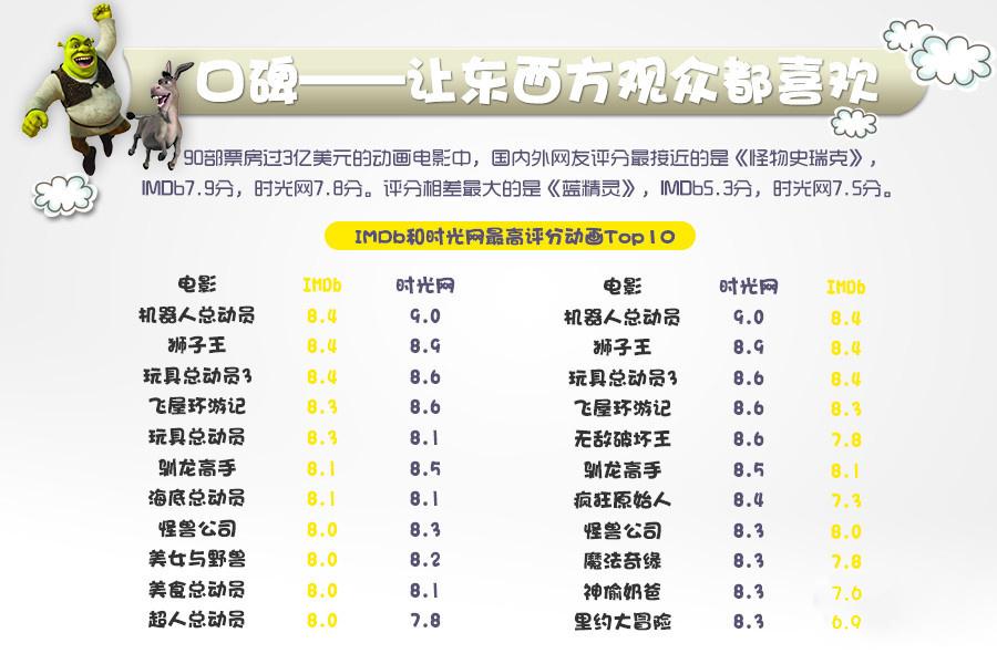 对于动画片,国内外观众各有评价标准。但大体上,大家对好电影的认识保持一致。比如,在IMDb和时光网的评分榜上,《机器人总动员》、《狮子王》、《玩具总动员3》、《飞屋环游记》四部电影均位列前四。但也有个别在国外反响平平,在国内很热的电影,比如《蓝精灵》。