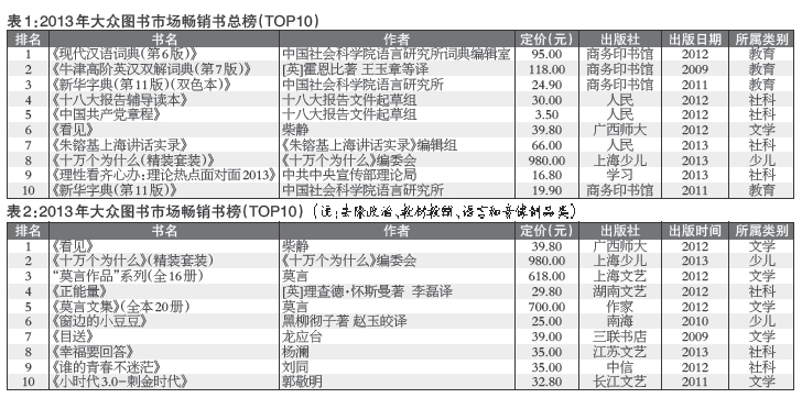 ●《看见》等时政励志读品笑傲2013年图书市场。就畅销书来说,知名记者和主持人柴静的《看见》是2013年中国图书市场当仁不让的王者,荣膺两大图书市场排行榜的榜首,名人效益显著。