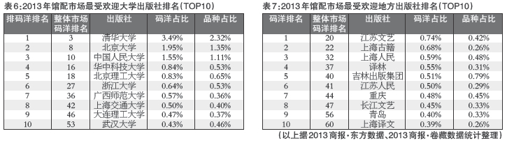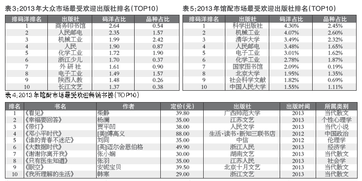 ●商务印书馆、人民邮电出版社、机械工业出版社:零售市场,读者最爱。2013年,从码洋上来看,在零售市场,中国读者最爱的三大出版社分别是:商务印书馆、人民邮电出版社和机械工业出版社。而在各细分市场中,排名又有不同。在中国读者最爱的文学类市场中,前三甲分别为长江文艺出版社、人民文学出版社和湖南文艺出版社;社科类市场的前三名则被人民出版社、中信出版社和中国华侨出版社占据。