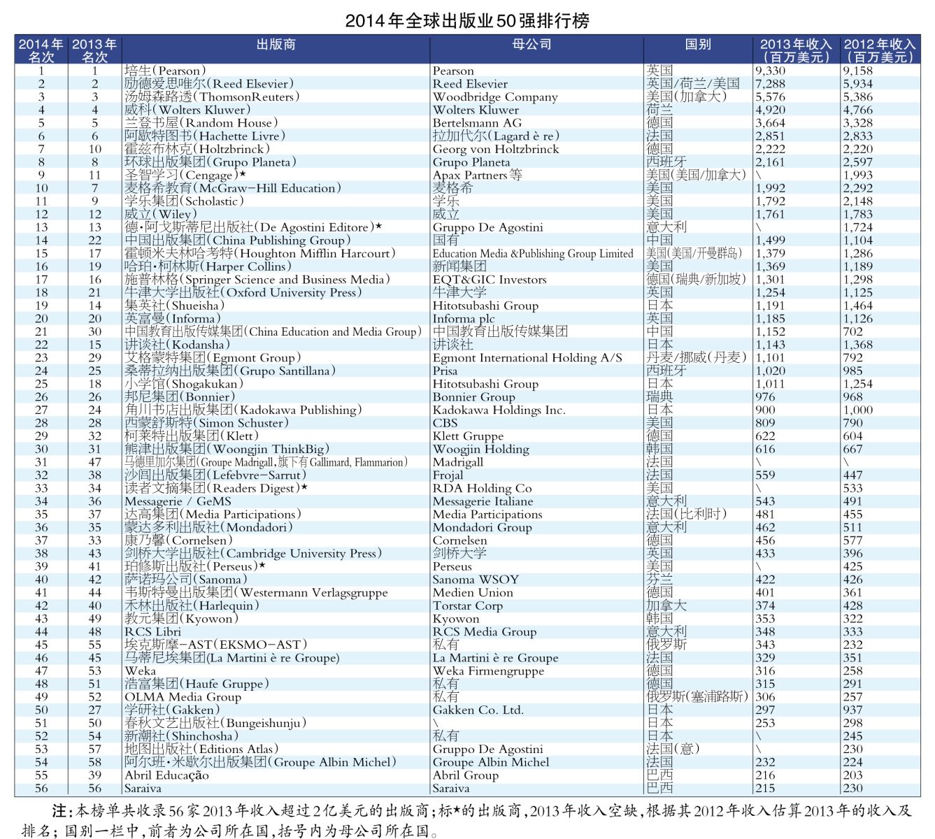 榜单分析报告指出,出版商受并购、数字整合和全球化驱动,仍在转型当中。庞大的本土市场,为巴西、俄罗斯、印度和中国这些新兴市场国家的企业发展提供了巨大空间,在2013年的榜单中可以看到第21至50名之间有不少来自这些国家的身影,但2014年的榜单中来自新兴国家的企业数量有所减少,这与这些国家受欧元汇率升值影响,进口受损有关系。