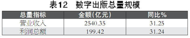2013年,数字出版实现营业收入2540.4亿元,利润总额199.4亿元,分别增长逾3成(见表12)。