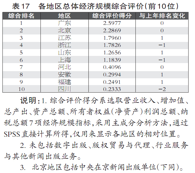 对全国31个省(自治区、直辖市)与新疆生产建设兵团新闻出版业的总体经济规模进行综合评价、排名(见表17)。