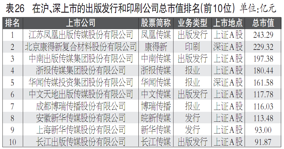 在沪、深上市的出版发行和印刷公司总市值排名以2013年12月31日收盘价计算,在上海和深圳上市的26家出版发行和印刷公司股市总市值合计2232.1亿元,同比增长48.6%(见表26)。