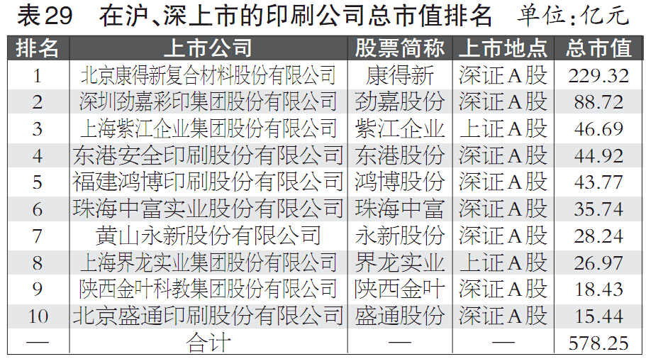 10家上市印刷公司股市总市值合计578.3亿元人民币,同比增长39.0%(见表29)。