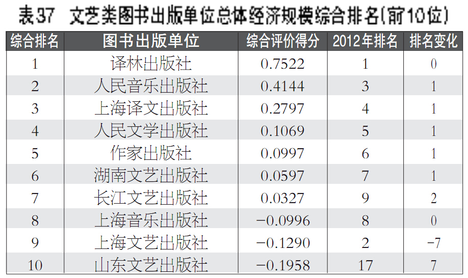 与2012年相比,山东文艺出版社跻身前十,漓江出版社跌出前十(见表37)。