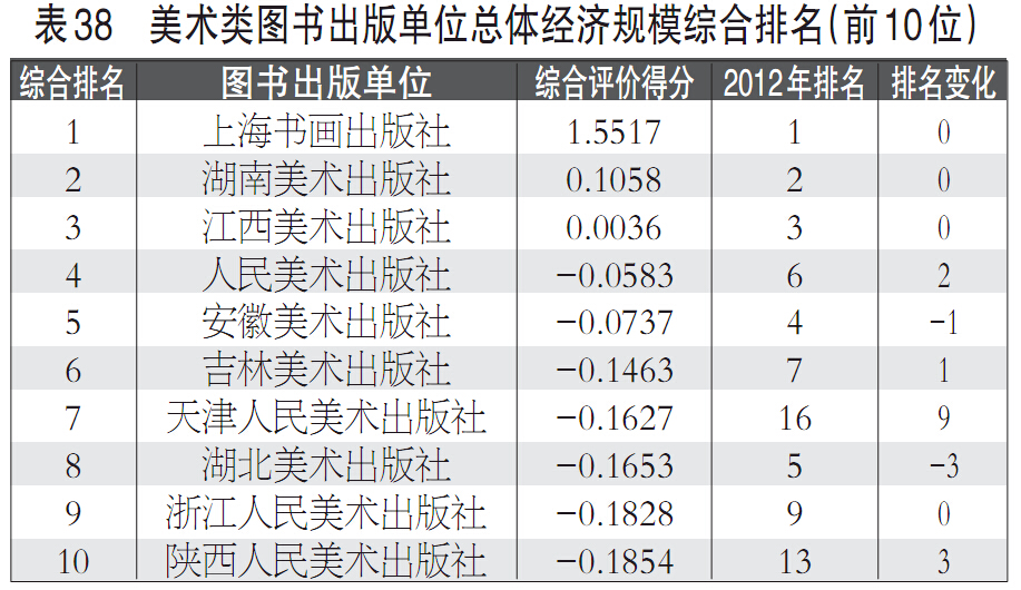 与2012年相比,天津人民美术出版社和陕西人民美术出版社跻身前十,海峡书局出版社和江苏美术出版社跌出前十(见表38)。