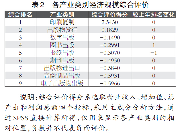 对图书出版、期刊出版、报纸出版、音像制品出版、电子出版物出版、数字出版、印刷复制、出版物发行和出版物进出口9个新闻出版产业类别的总体经济规模进行综合评价。印刷复制、出版物发行和数字出版分居前三位,排序与上年相同,三者合计占全行业营业收入的89.6%和利润总额的83.1%。