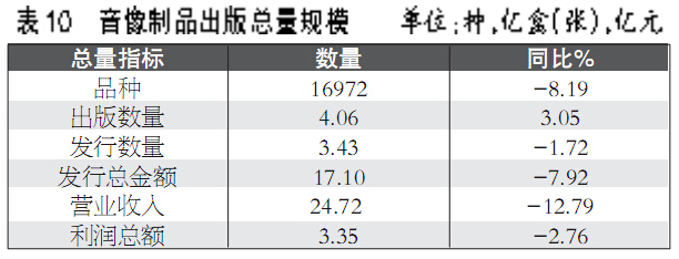 2013年,全国共出版音像制品16972种,同比下降;出版数量4.1亿盒(张),同比增长;发行数量、发行总金额、营业收入、利润总额同比均下降(见表10)。