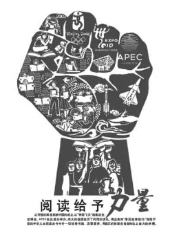 《阅读给予力量 阅读实现梦想》融合传统版画和剪纸手法,将各种读书场景组成代表力量的拳头,并加入2008北京奥运会、2010上海世博会、2014APEC会议等元素;《Success次 车票篇》巧妙运用火车票形式,起点为“探索”,终点为“知识”,列车则是Success(成功)次;到站时间为“读书没有终点站”,发车时间为“2015年4月23日”,比喻乘坐“梦想号”可抵达成功之境;《这颗粮食不能缺》以玉米、小麦、黄豆、大米、花生等粮食入画,嵌入“书籍”这一暗喻“精神食粮”的元素,巧妙而和谐;《点亮心灵:解密》以书作为迷宫的边界,告诉读者:独特的读书方法,就是一本通关宝典,要多读书、读好书、善读书;《及时充电》以书的侧立面作为电源插座的插口,形象而直观地说明要勤阅读、勤充电;《最美饰品 耳坠篇》《最美饰品 项链篇》将书作为耳环和项链的挂坠,告诉人们:用珠宝装饰外表,不如用知识充实内涵;《阅读如食》将书的切角画作蛋糕,“有时是温饱,更多是享受”,诠释图书是丰润心灵的精神食粮。