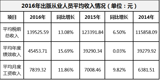 从收入结构上看,662位出版从业人员2016年的平均月度收入是7839.32元,同比增长11.86%,较2015年的增幅9.82%提高了2.04个百分点;平均年度绩效是45453.71元,同比增长15.69%,较2015年的增幅0.03%提高了15.66个百分点。可见,出版从业人员2016年的收入增长更多是由年度绩效的上涨带动的。