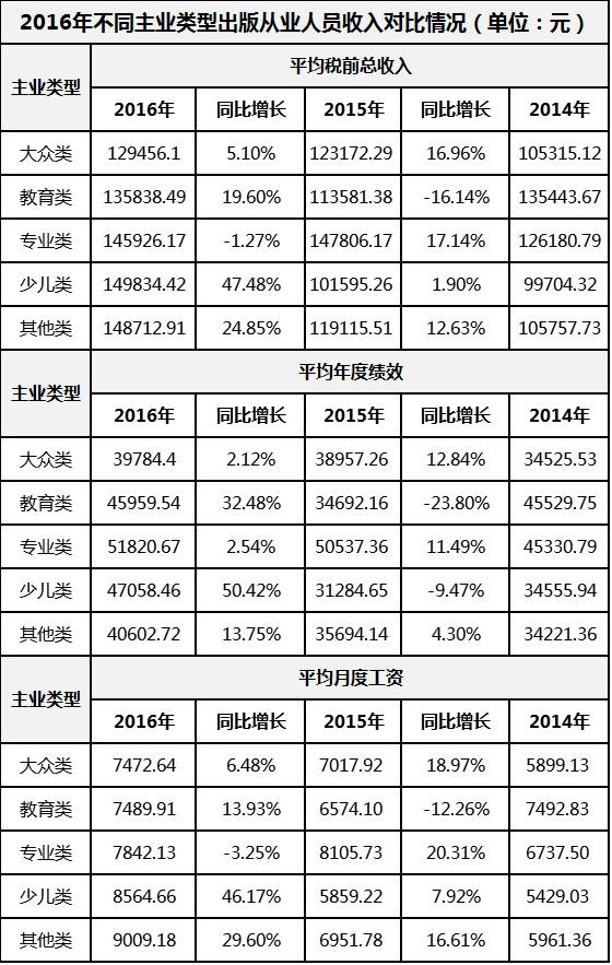 另外四类出版机构从业人员的收入水平排序为,其他类,148712.91元;专业类,145926.17元;教育类,135838.49元;大众类,129456.10元。除专业类下降了1.27%外,均有不同程度的增长。