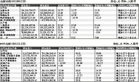 有分析师认为,随着国家《文化产业振兴规划》等一系列政策措施的出台,文化传媒产业必将迎来新一轮发展高潮,而资源整合、技术融合、传播渠道扩张以及相关产业融合也将是文化传媒行业未来发展的明显特征。具体到书业各主营业务,尽管正面临新媒体冲击、循环教材使用、教材发行体制改革、在校生人数下降以及电子商务平台经营效果低于预期等诸多不利因素,但不足发达国家文化消费水平1/4的现状仍然昭示了巨大的发展空间。 比如在时代出版2009年主营贡献较高的三大业务中,教材教辅和印刷业务的表现就较好,其中教材教辅营收9.1亿元,不仅有效化解了循环教材使用的不利影响,还在教辅的拉动下实现了28%的强劲增长;从报表上看印刷业务收入下降14%,但实际是通过技术改造、引进国外先进设备和整合并购等方式扩大了印刷产能和业务范围,承接了大量内部订单,报表体现的仅仅是外接印刷收入;但因缺少2008年“鬼吹灯”系列和《虹猫仗剑走天涯》系列这类表现突出的畅销书,一般图书同比略降0.5%,不过中小学馆配和农家书屋分别实现销售码洋0.5亿和0.67亿。而出版传媒因其募投项目发挥作用,出版业务收入同比增长35.77%,票据印务业务收入也同比增长10.79%。 新华传媒2009年业绩不佳主要是广告需求下滑所致,在各类业务收入中,报纸发行及广告收入的下滑幅度最大,达到32.56%,直接拖累了公司整体业绩。但借助上海世博会的契机,以上海新华书店和上海书城为品牌号召力,新华传媒展开了一系列卓有成效的营销活动,图书出版业务收入同比微涨0.14%。另外,公司打造的B2C电子商务平台“一城网”突破了传统格局,在网上商城建设方面也取得了一定成效。与此同时,皖新传媒因加大门市图书销售及多渠道销售,扩大了销售量,并在政府两大采购项目中中标,新增农家书屋及中小学馆供销售,一般图书销售发行业务营收较上年同期增长 22.60%;而新型业务音像出版、广告新媒体也分别较上年同期增长 155.87%和 88.94%。此外,新华文轩的产品、征订、零售以及其他分部营业收入也有不同程度的增长,其中产品营业额增长9.3倍至2.85亿元,零售营业额增长24.4%至5.04亿元,征订营业额则上升4.9%至22.88亿元,占到总营业额71.3%。