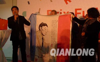 董强(左)向获奖嘉宾赠送印有范曾先生亲自绘制的傅雷肖像的丝质纪念品。