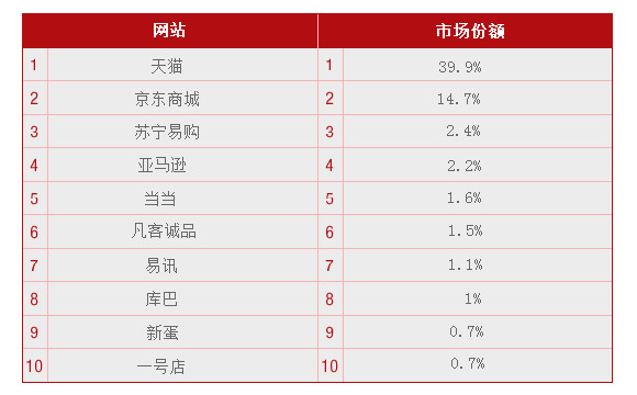 22、以下是中国十大电商网站,占整个市场的比重超过65%。