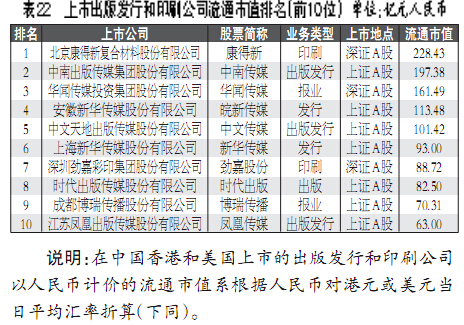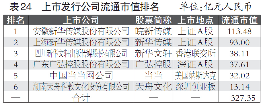 15家上市书报刊出版公司股市流通市值合计854.4亿元人民币,同比增长114.9%(见表23)。