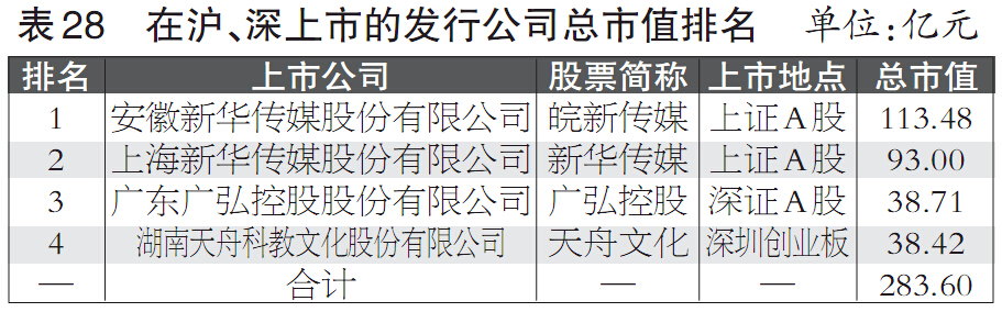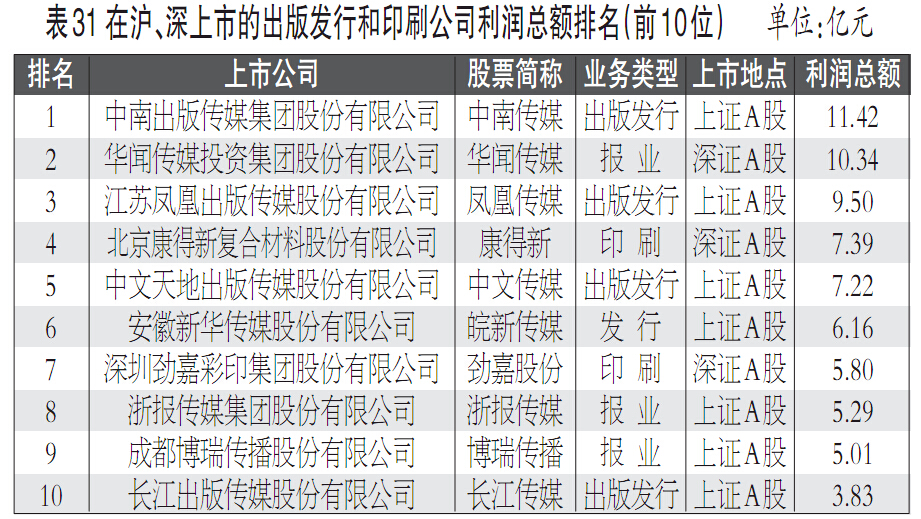 在沪、深上市的出版发行和印刷公司利润总额排名2013年,在上海和深圳上市的26家出版发行和印刷公司利润总额合计82.9亿元,同比增长11.0%。