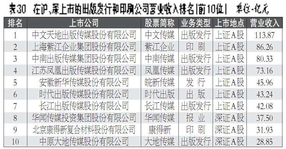 在沪、深上市的出版发行和印刷公司营业收入排名2013年,在上海和深圳上市的26家出版发行和印刷公司营业收入合计804.5亿元,同比增长13.2%。