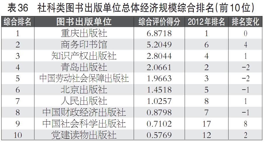 与2012年相比,山东文艺出版社跻身前十,漓江出版社跌出前十(见表37)。