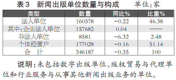 2013年,全国共有新闻出版单位34.6万家。其中,法人单位16.1万家,个体经营户17.7万家(见表3)。