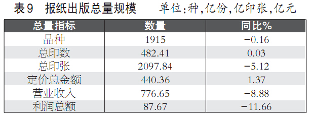 2013年,全国共出版报纸1915种,同比下降0.2%;总印张2097.8亿印张,同比下降5.1%;总印数、定价总金额微增;利润总额下降(见表9)。