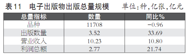 总量规模2013年,全国共出版电子出版物11708种,同比下降;出版数量、营业收入、利润总额均告增长(见表11)。