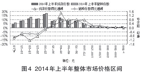 从码洋份额来看,定价在25~30元的中等价位区间居首,码洋份额为16.55%,同比微降0.16个百分点。其中,教育类码洋份额最高,达29.29%。其次是定价在35~40元的中高价区间,码洋份额为12.36%。其中,社科类码洋份额最高,达30.71%。再次是定价在15~20元的低价区间,码洋份额为11.25%。其中,少儿类码洋份额最高,达43.45%。与去年同期相比,定价低于30元的中低价区间,码洋份额全数下跌;其中15~20元区间跌幅最大,同比下降1.24个百分点。定价高于30元的中等和高价区间,码洋份额全数上升;其中35~40元区间增幅最大,同比上升1.47个百分点(图4)。 上一页 [1] [2] [3] [4] [5] [6] [7] 下一页