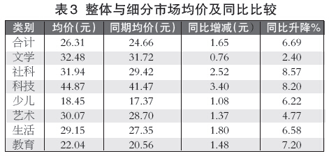 2014年上半年零售图书均价为26.31元,较2013年上半年均价24.66元上升了1.65元,增幅为6.69%。如表3所示,细分市场中,科技类均价最高,达44.87元,其次为文学类、社科类和艺术类,分别为32.48元、31.94元和30.07元。少儿类均价最低,为18.45元;其次是教育类,均价为22.04元。同比来看,七类细分市场均价全数同比上升,社科类和科技类领涨,增幅分别为8.57%和8.20%,其次是教育类和生活类,分别同比上升7.20%和6.58%。文学类、艺术类和少儿类增幅相对较低,分别为2.40%、4.77%和6.22%。