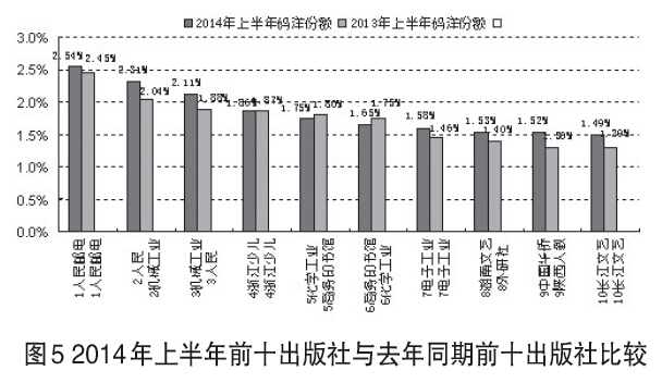 2014年上半年十强社中的七家码洋份额出现不同程度的上升。如图5所示,人民邮电出版社依然位列榜首,码洋份额为2.54%,同比上升0.09个百分点,该社三甲图书分别为《飞马奇遇记电影连环画/喜羊羊大电影6》、《狼国女王/沈石溪动物小说·感悟生命书系》和《巴啦啦小魔仙之魔法的考验(电影连环画)》,与同名影视作品结合的少儿动漫衍生读物为一大亮点。人民出版社超越机械工业出版社升至榜眼,码洋份额为2.31个百分点,同比上升0.43个百分点,登榜图书多为党政读物。机械工业出版社以2.11%的码洋份额位列第三,同比上升0.07个百分点,该社三甲图书分别为《卓有成效的管理者(珍藏版)》、《微信,这么玩才赚钱》和《妈妈就是好老师·认识汉字/Q书架·阿拉丁Book》。湖南文艺出版社和中国华侨出版社新晋十强,码洋份额分别为1.53%和1.52%,同比增幅分别为0.36和0.34个百分点。湖南文艺社的三甲图书分别为《从你的全世界路过:让所有人心动的故事》、《爸爸去哪儿(官方授权图文版)》和《大清相国(典藏版)》,中国华侨社的是《你若安好便是晴天:林徽因传》、《阿狸·尾巴》和《后宫·如懿传4》。除上述出版社,还有五家出版社连续两年进入前十行列,依次是浙江少儿出版社、化学工业出版社、商务印书馆、电子工业出版社和长江文艺出版社。 上一页 [1] [2] [3] [4] [5] [6] [7] 下一页