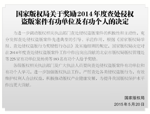 2014年度查处侵权盗版案件有功单位及有功个人名单