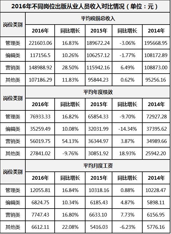 另外四类出版机构从业人员的收入水平排序为,其他类,148712.91元;专业类,145926.17元;教育类,135838.49元;大众类,129456.10元。除专业类下降了1.27%外,均有不同程度的增长。