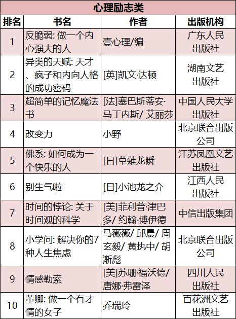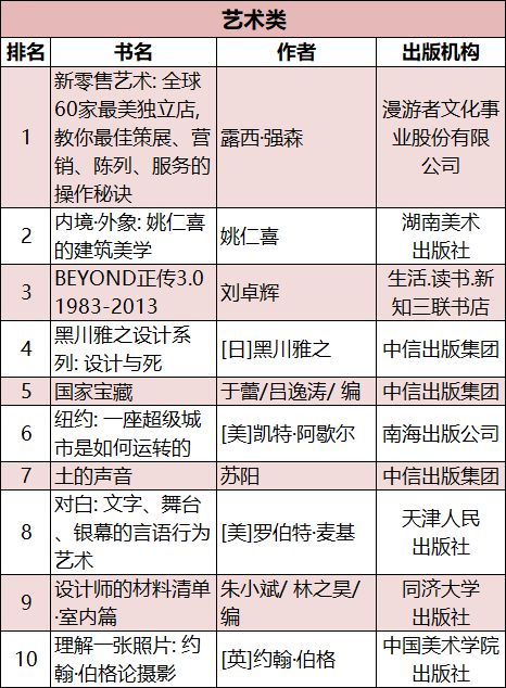 ◆ 艺术类TOP10中,中信出版集团依然占据最多席位,上榜图书包括《黑川雅之设计系列: 设计与死》《国家宝藏》《土的声音》3种。另外,湖南美术出版社、同济大学出版社、中国美术学院出版社也在该领域深耕多年,核心竞争力明显。